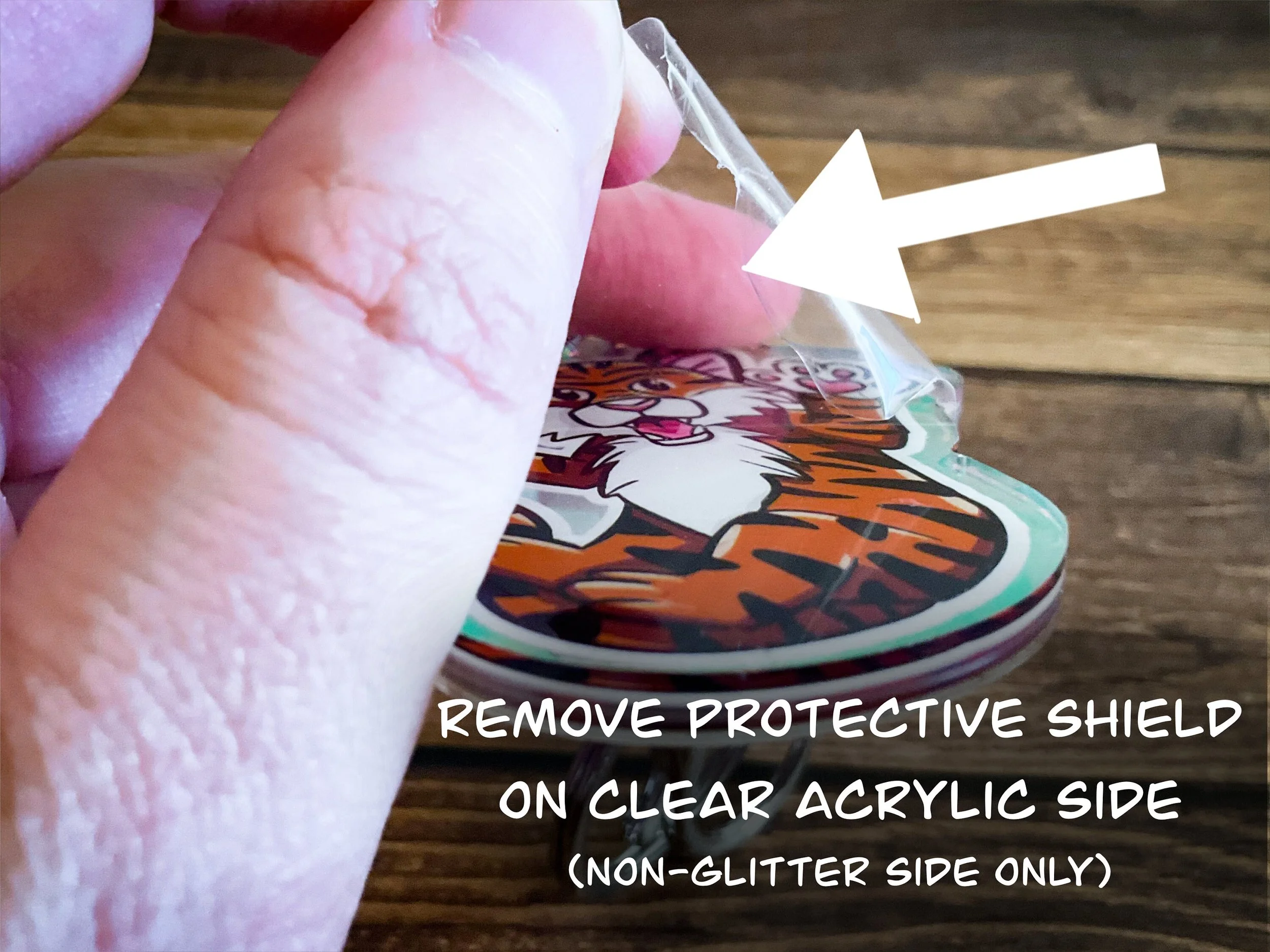 All keychains come with a protective seal on the outside to protect it during shipping. If a glitter top coat is applied, there will be no protective seal on that side due to the extra coating. However, the backside will have a protective seal to remove upon arrival. Colors will look dull until the seal is removed. Seal may look scratched or rough. The acrylic underneath the seal should be smooth.