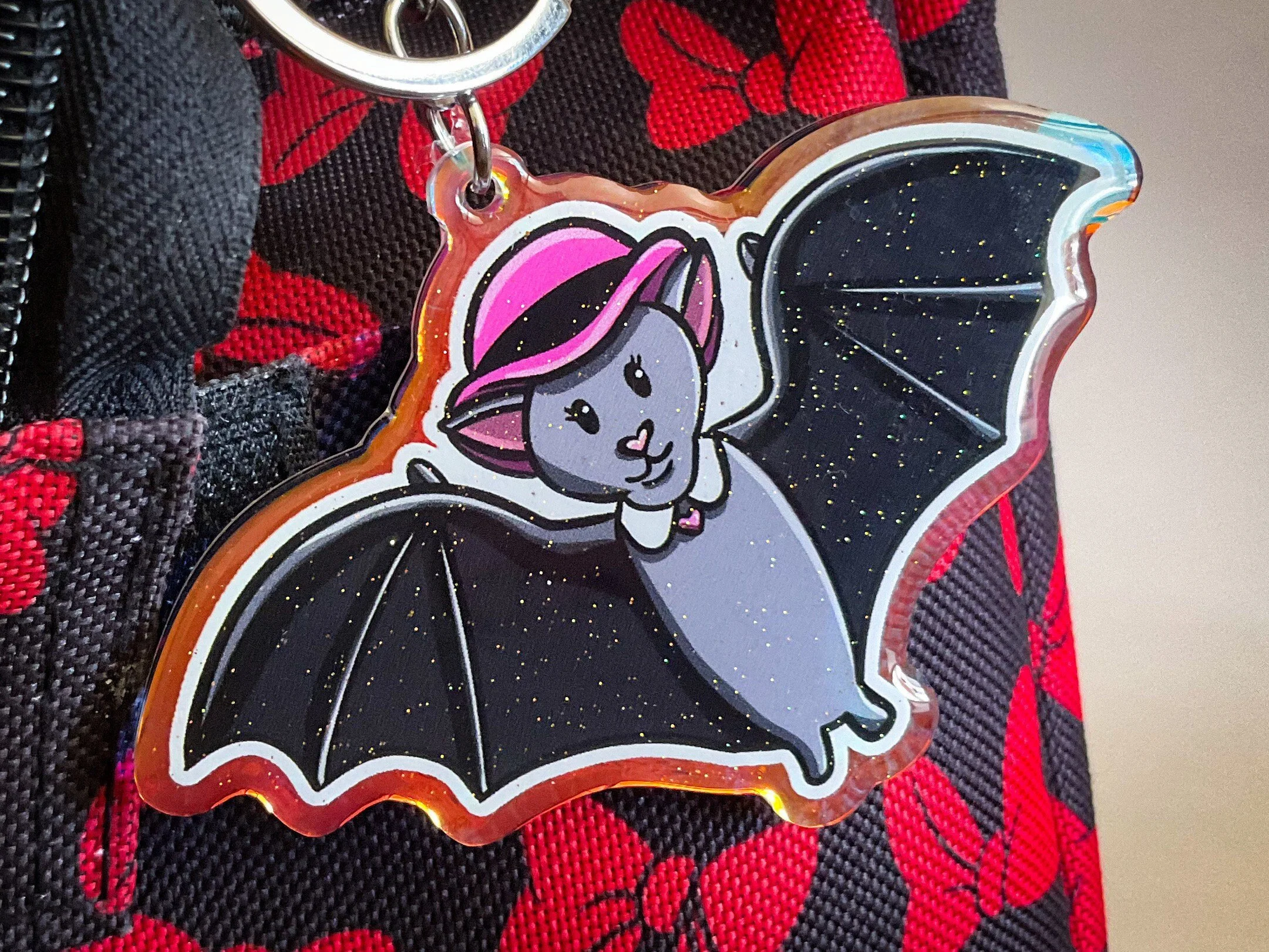 This adorable bunny is decked out in her favorite hat! She makes a great gift for bunny lovers of all ages! he charm on this keychain is made of clear, holographic acrylic so it catches different colors in the sunlight. It also features a sparkly top coat on the front side and the design is visible on both sides of the charm. Each charm is 2.5 inches in height.