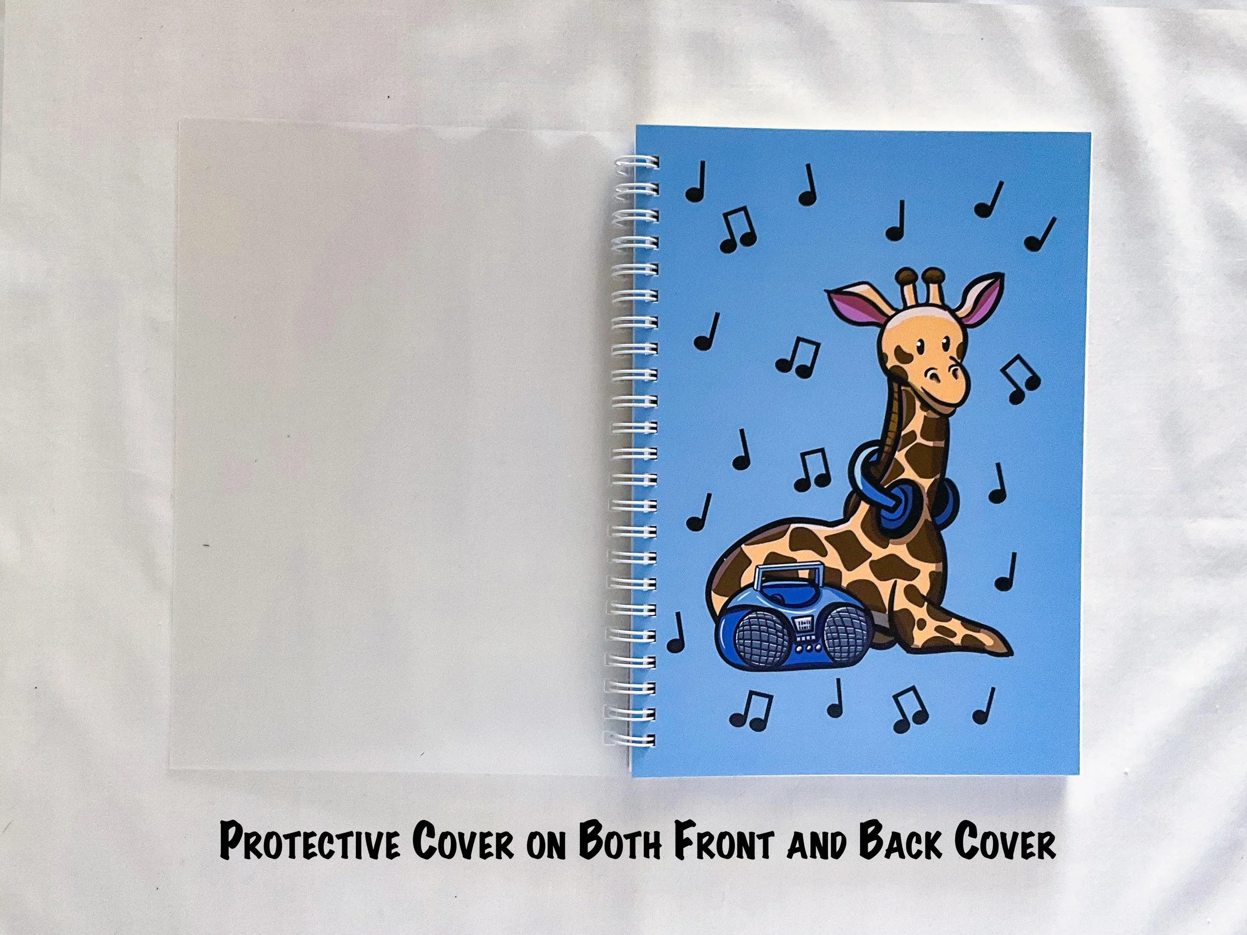 This cute giraffe loves to listen to music. It's the perfect gift for both giraffe and music lovers! This notebook features 100 sheets of double-sided lined paper, perfect for any journal or memo pad needs! It is spiral bound with a soft cover. The art is featured on both the front and back cover. A protective cover keeps both sides safe from normal wear and tear.